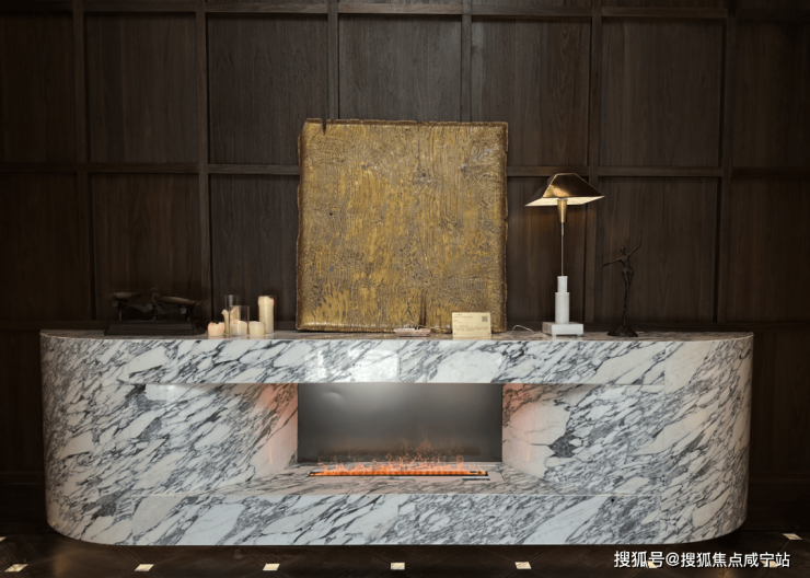 左侧是休息区,摆放着一些精致的雕塑及其他小品摆件,中央壁炉很有意式古典风情,配上白杨木大漆艺术品,古典又华丽,未来业主可以在这儿休憩、等车、接待等。