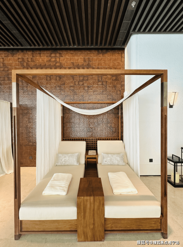再来看泳池,无边泳池正对的就是落地玻璃,窗外同样是下沉式庭院,水景形态各异,泳池边摆放的躺椅,颇有巴厘岛风情,归家即享有度假的生活。