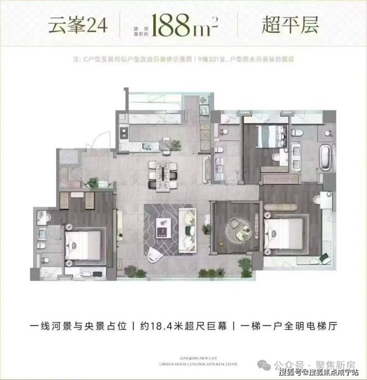 建面约125㎡为松江板块罕见的四开间朝南三阳台户型,三开间卧室朝南,搭配多阳台与飘窗,采光通透。一梯一户同样赋予独享梯厅的尊崇体验。空间上,约3米层高营造大平层气场。横厅连接近10㎡朝南阳台,兼顾生活与观景;北向约3.85米面宽餐厅与厨房等宽,备餐时可与家人互动。主卧南向超大景观飘窗搭配全明主卫,北次卧约9㎡可灵活改造,满足多元需求。