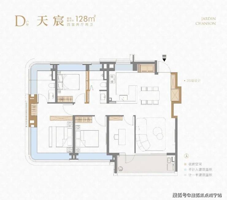 建面约128㎡户型则是做到4房2卫的功能性,适配市面上越来越多的二胎或三代同堂家庭。格局上进化为南向四开间,保证了更充沛的阳光。客餐厅+超大尺度阳台贯穿南北,进门视野无遮挡,大宅气度油然而生!