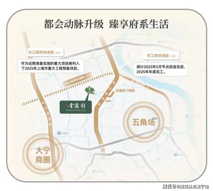 江湾金茂府不仅能迅速连接核心路网,更被稳稳地包裹在“金色中环”之内。再加上即将完工的军工路快速路和规划中的长江西路快速路,开车出行也能快速通达市中心,大大节省了出行时间,让业主在城市中自由穿梭,轻松掌控生活节奏。