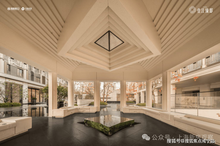 浮岛殿堂的水上意境:当建筑之上的天光从水院折射入内,非遗陶板与玻璃构筑出的悬浮视觉奇迹,便凝固为一道精神地标。步入其中,于水院之畔小憩,不仅是业主的惬意日常,更是“自然与建筑共生”的精神对话。