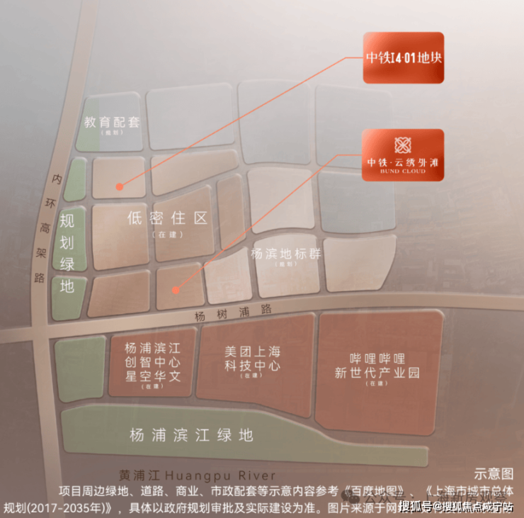 块属于杨浦滨江“九宫格”之一,紧邻内环高架、12号线宁国路站,直线距离滨江约700米。地块北面是一所九年一贯制学校,南侧是中建壹品·外滩元境;周边还有已经售罄的海玥外滩序BUND98、中建壹品·浦江之星项目。