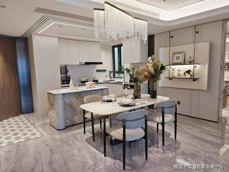上海徐汇海上清和玺☎售楼处电话/地址 400-880-0703 √√(营销中心)柜门白色烤漆面板,抽屉分区也都是帮大家细致划分,如多功能调味拉篮+谷物抽+碗碟拉篮等。岛台上配置可升降插座,铝合金抽屉,石材背景板的金属开放格实用性很强。