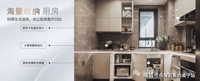 橱柜收纳系统:特别预置洗碗机点位、柜内下拉篮式设计、不锈钢挡油板、柜下操作灯、烹饪全流程功能动线一体化设计;