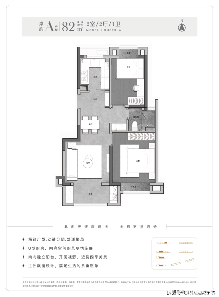 建面约82㎡两房,南向开间约6.3米,除了宽敞的主次卧,还做了全明的三段式分离卫浴。