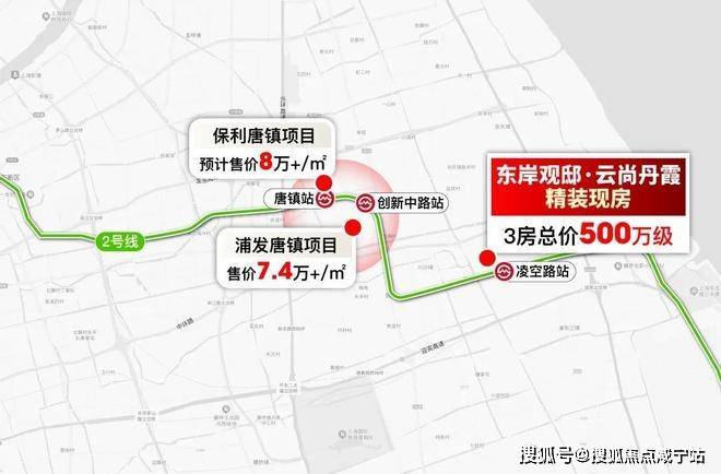 首先向西,川沙可经由2号线承接张江科学城高精尖人才置业需求。并且在唐镇站新房8万+/㎡,创新中路站7.4万+/㎡的背景下,均价约6.4万/㎡的的东岸观邸·云尚丹霞已经形成了巨大的剪头差。