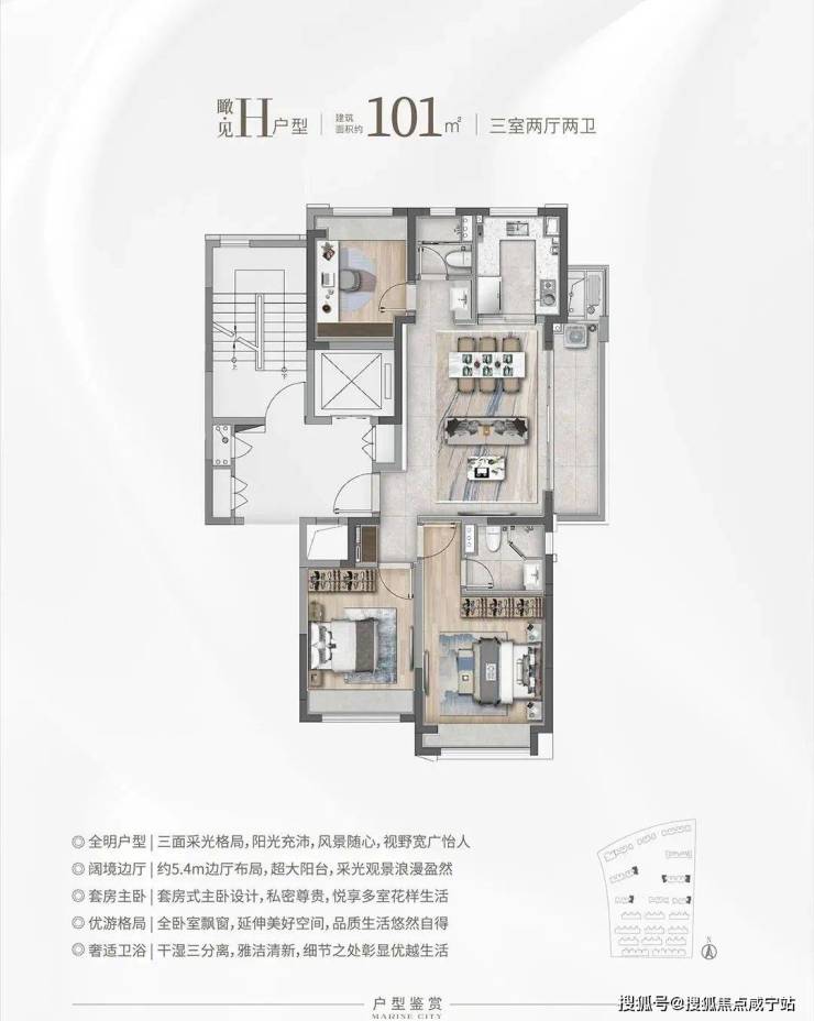 ②建面约99㎡H户型:三面采光,全能景观王炸边厅户型!