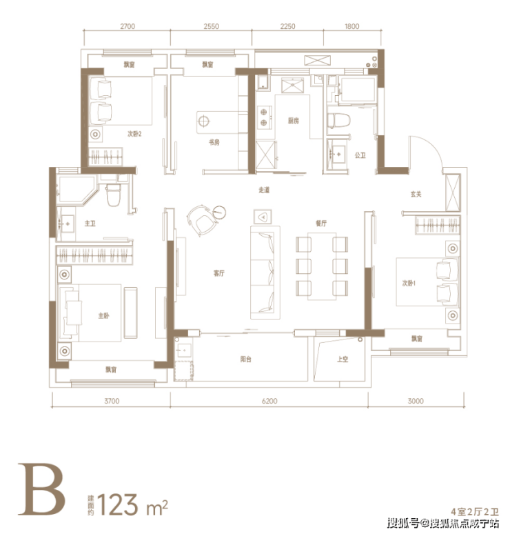 建面约123㎡做到了4房,且客厅面宽达6.2米,主房间宽达3.7米,且北面2间小房间根据需求可打通。