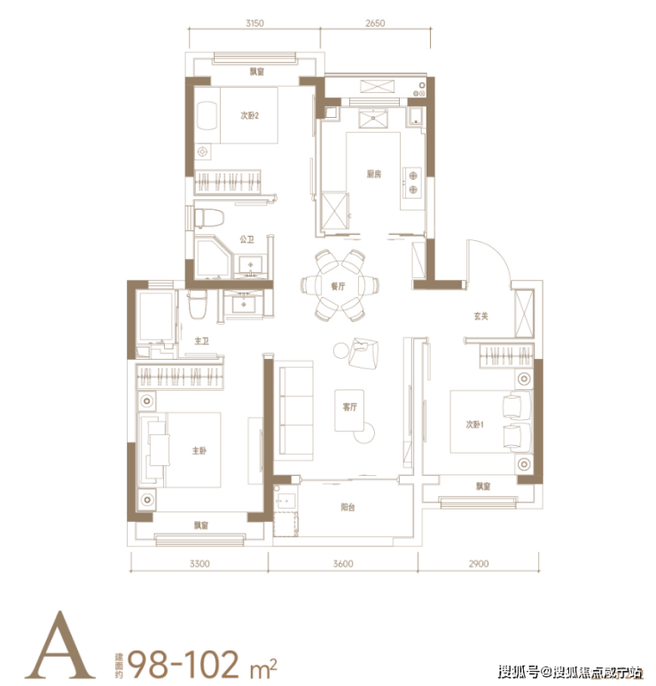 建面约100㎡是实打实3房,客厅宽度达3.6米,主房间宽达3.3米,连北面小房间也能放1.5米宽的床。