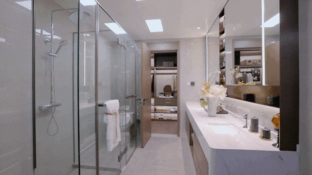 约55㎡豪华全套房主卧,除了放一张超大双人床,还能安排上男女双衣帽间、带双台盆的独卫,在功能方面直接多了一个level,关上房门就是主人的“小世界”。
