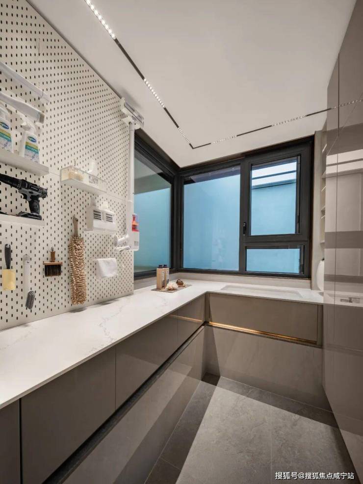 创新 G 字形厨房,连接岛台形成互动空间,配置博洛尼品牌橱柜打造了钻石型步入式收纳柜,实现各类厨具收纳MAX!配备了⼤⾦的厨房专⽤空调、嘉格纳五件套包含吸油烟机、灶具、洗碗机、蒸烤⼀体机和内嵌双冰箱(冷冻与冷藏分开)、日本骊住原装进口多功能超大单槽、石材岛台+升降电源,品质相当在线!
