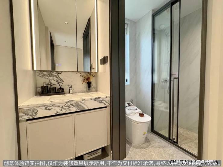 卫生间镜柜带有除雾功能,内置插座、吹风机架以及美妆冰箱(主卫);三段式移门有效放大了淋浴间的进出空间,小户型也能生活得更从容。