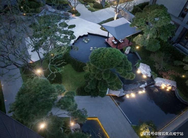 庭院的选材也极具讲究:太行山金景石堆叠成小山丘,岭南古桩铁冬青与中华原生乌桕树移栽而来,蕴含“聚财守业”的美好寓意。细节之处,经得起推敲,让人越看越有味道。