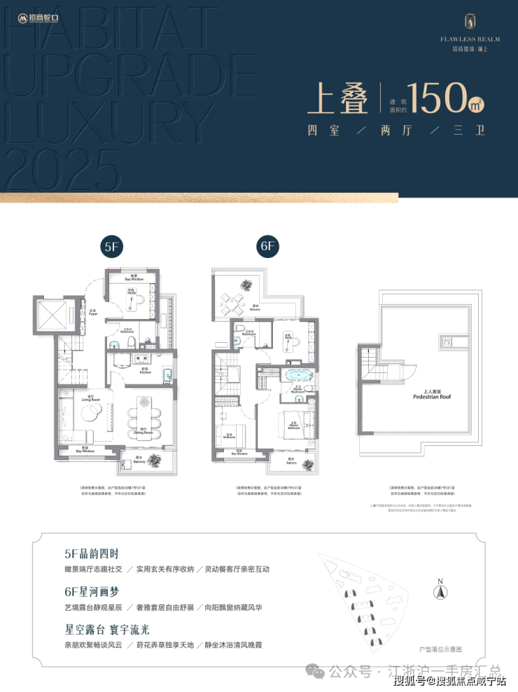 建筑面积约150㎡上叠整层主卧增设优化,自带书房+南北露台,顶楼设有大尺度可上人屋面,既可与亲朋欢聚畅谈风云,也可莳花弄草独享天地。