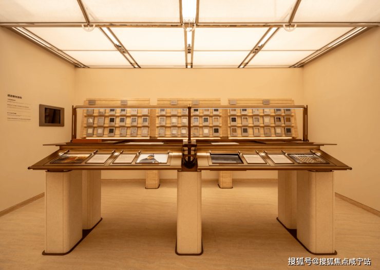 皇家白奢石 、Prada绿皮革面奢石、砖纹定制铝板... 细节中透露出精致与考究。工艺工法间对72种奢材的展示,让人心悦诚服。