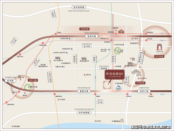 上海徐汇陕西南路888售楼处电话:400-8800-703位于陕西南路肇嘉浜路口,属双轨地铁房:距离地铁9号线、12号线嘉善路站直线距离约150米.
