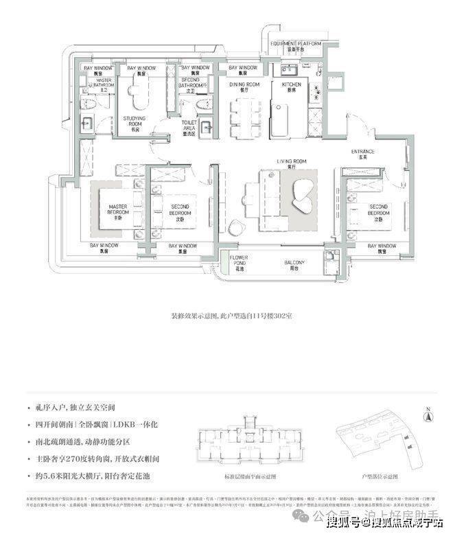 建面约120㎡的户型,定制LDKB一体化宽厅,更舒适的功能定制,270°转角窗观景套房设计,实现了居住品质与观景的完美结合。