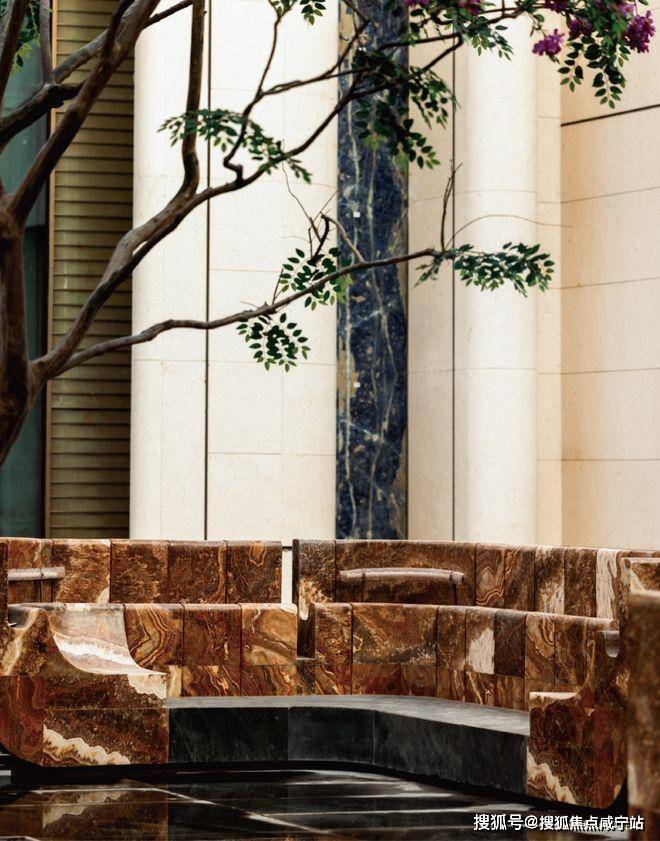 比如,整个下沉式庭院材料选用土耳其进口老虎玉由匠人耗时60天手工打磨定制,可见海上·清和玺对业主归家仪式感设计的用心与苛求。海派光厅之外的归家迎宾树木更是由设计师辗转多个城市才寻到的、树龄超60年的福木“紫薇”
