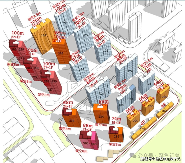 项目将建造9栋高层住宅,其中西侧三栋标红的楼栋,被旋转至西南方向,确保三栋楼互不遮挡,位于建筑上部50米高的住宅单位将能从各个角度欣赏到江景及S湾。