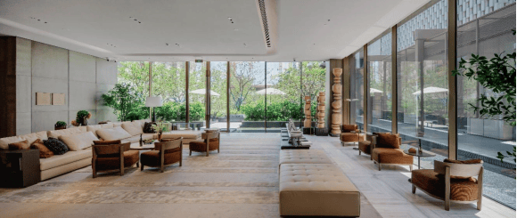 悠club下沉会所规划健身房、瑜伽室等专属空间,引进宇航员级健身设备REELIFE,以大面积的窗景设计,将自然与艺术融入运动视野,一路之隔的峯范打造高规格泳池,双泛会所构成全维生场域,重新定义自在与热爱并存的当代精致生活。