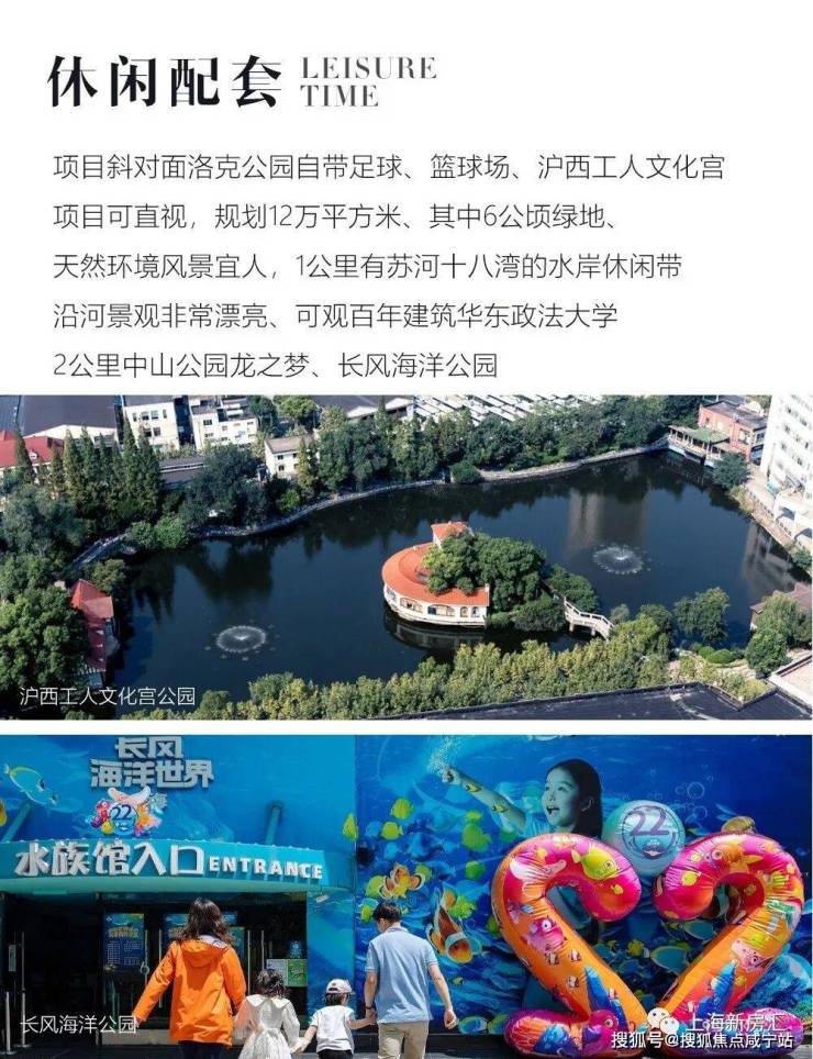 休闲方面,项目斜对面洛克公园自带足球、篮球场。沪西工人文化宫 (项目可直视,规划12万平方米、其中6公顷绿地、天然环境风景宜人、) 1公里有苏河十八湾的水岸休闲带,沿河景观非常漂亮、可观百年建筑华东政法大学,2公里中山公园龙之梦、长风海洋公园