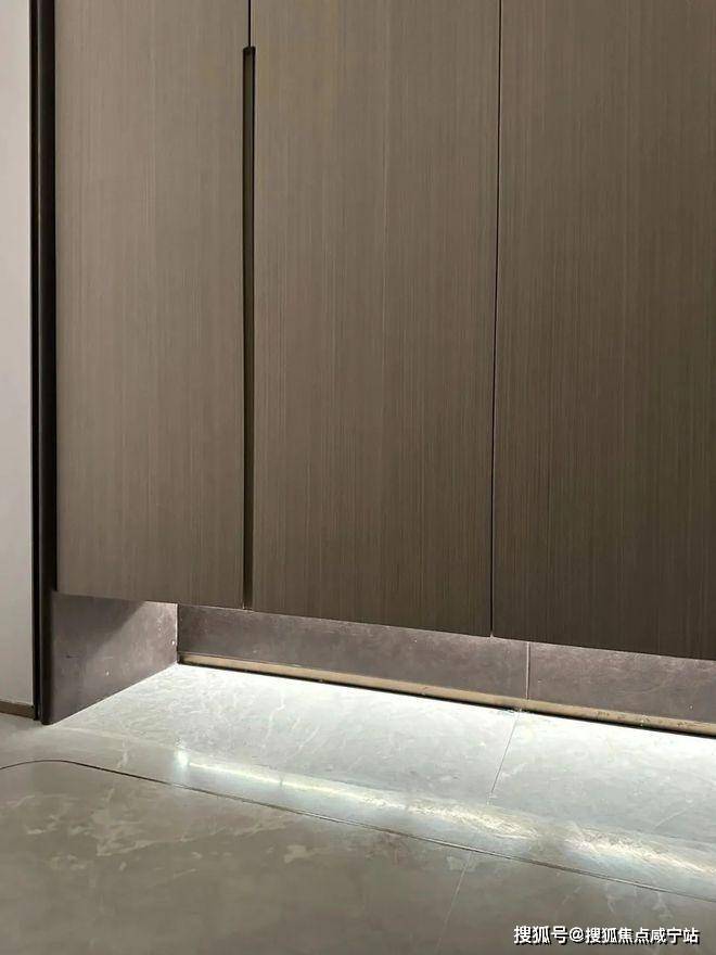 鞋柜下方做了悬浮处理,同样也是内嵌灯带,这里灯光的角度还会再调整,因为灯光映射在大理石地面上,要显得尽量柔和不刺眼;同时,鞋柜下方可放拖鞋,还能放扫地机器人,便于日常清扫打理。