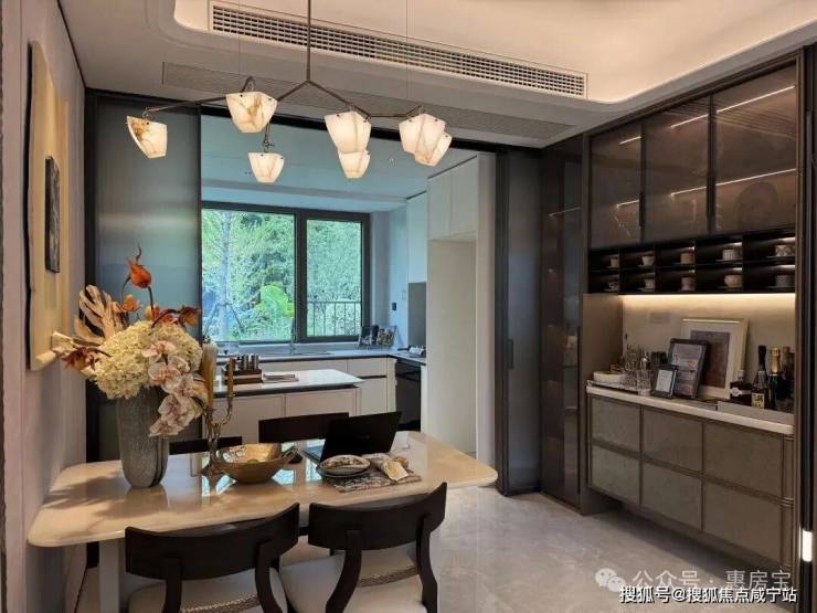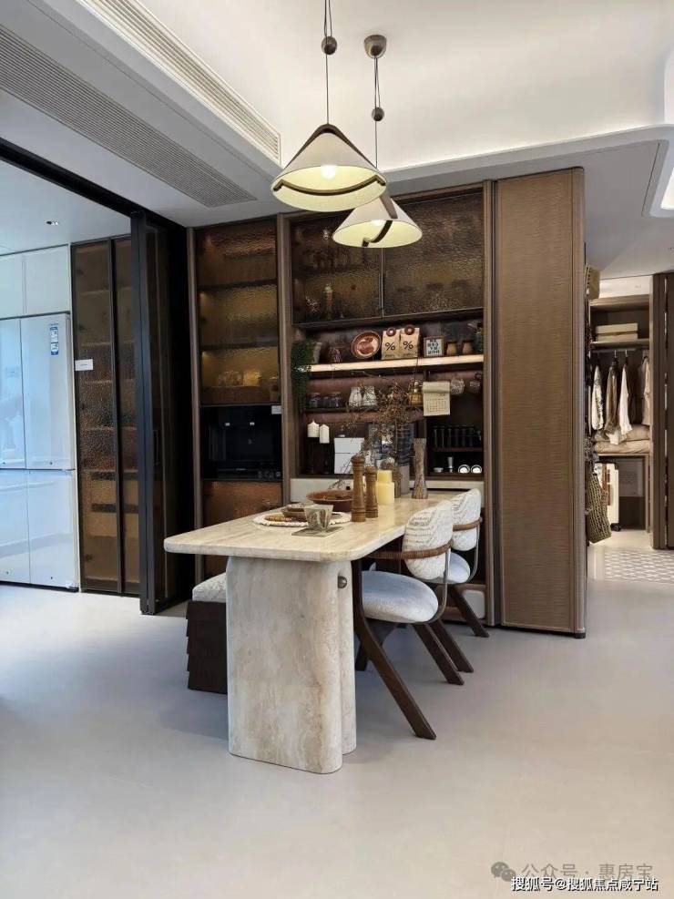 入户设置800库空间,它和传统玄关柜的区别在于:从“平面收纳”升级为“立体仓库”,储物功能更强大!约5米面宽横厅,多出来一个灵动空间,可根据个人需求定制为开放式书房、茶室等;岩板+金属饰面电视背景墙同样为交付标准;LDK一体化,餐厅区域可轻松放下6人位餐桌,并预留餐边柜位置;U型厨房,配置方太四件套(油烟机、灶具、洗碗机、蒸烤一体机)、科勒水槽及龙头等,基本所见即所得;同时厨房也附赠飘窗,将飘窗台面与橱柜一体化设计,做为了水槽区域,极大的提高了厨房空间的实用面积!边套户型主卧为270°转角飘窗,并预留两个衣柜空间;北卧为封闭阳台,实际交付时阳台会改造到位,地暖通铺,地板墙纸通铺,吊顶做好,可参考样间效果。综合来看,该户型还是非常不错的,满足改善需求的同时,各空间储物空间充足,完美解决了这一类客群的收纳痛点,作为项目主力户型,关注度很高!