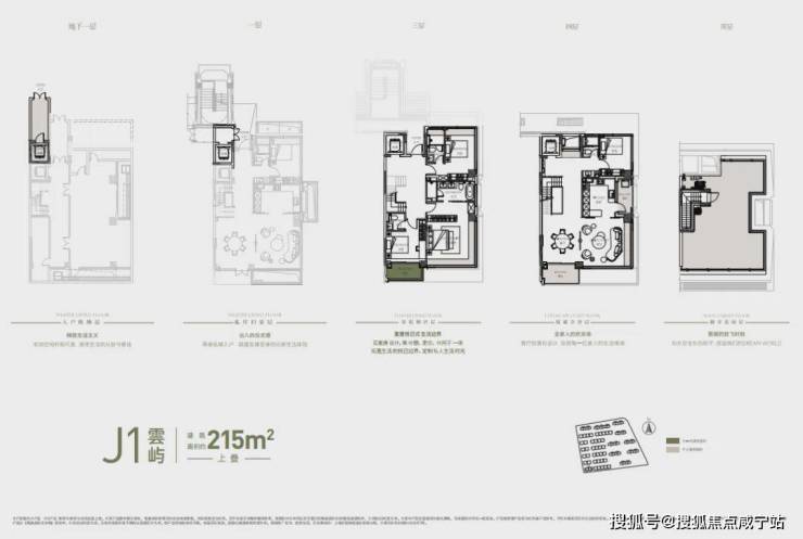 建面约215㎡上叠:屋面+庭院+地下室+露台+阳台的整体附赠空间约110㎡;