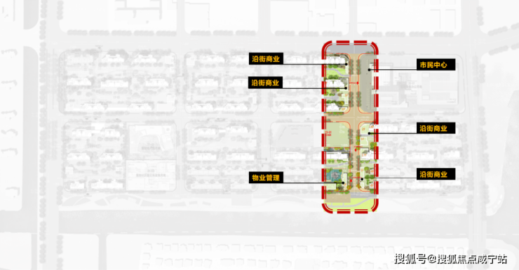 一街为活力商业街,通过纵向布局,在街道两侧配上丰富立体的商业,包括沿街商业、邻里中心、乐活商业街等,满足居民日常的需求。