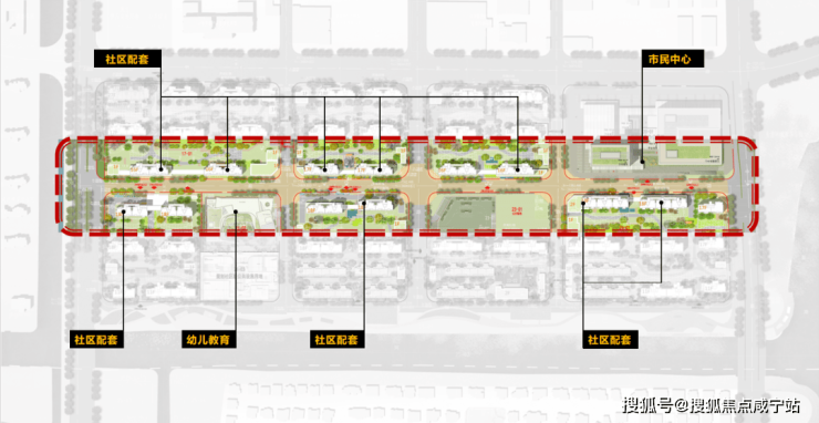 其中,一轴为生活街区轴,其聚合了文化活动室、生活服务中心、市民中心等丰富的公共空间,下楼可轻松享受到多元且丰富的邻里社交生活。