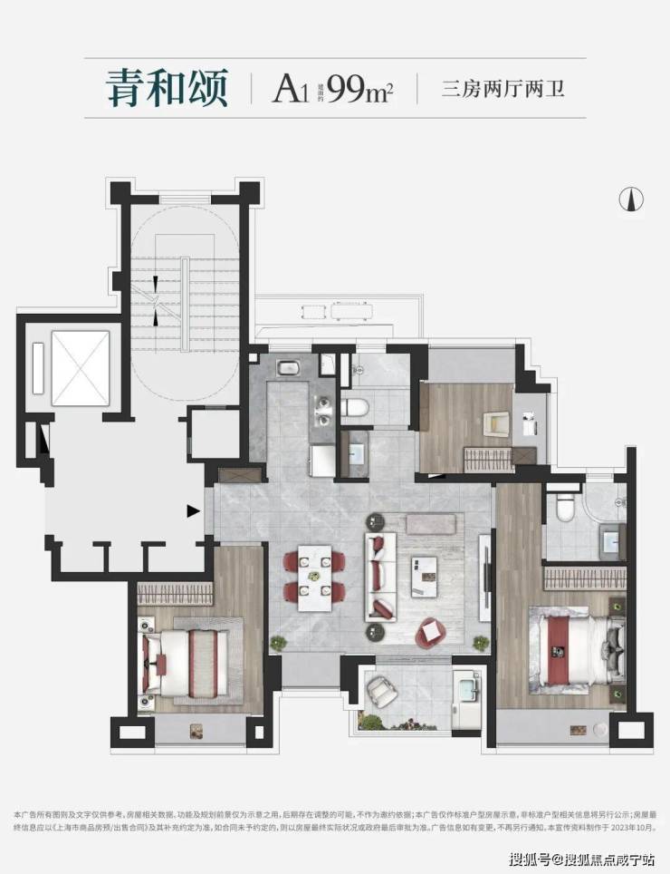 建面约99㎡3房(A1户型),做到了3.5开间朝南设计,整个户型几乎没有浪费面积~实现空间节约、居住升级等美好体验。