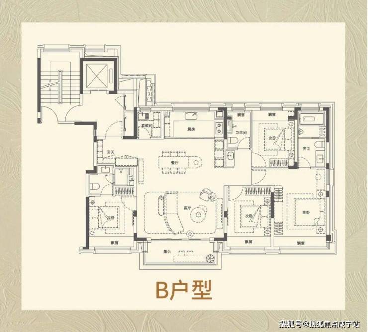 除了A户型,184的B户型则非常符合传统认知:经典的南北向,标准的超大面宽、短进深,克服了市区很多新房由于受地块限制,在设计时总是有一些空间不能尽如人意的弊端,四个空间朝南一定排开,全屋全明设计,没有死角,无论是空间感还是动线都很符合对户型要求较高的买家的需求。