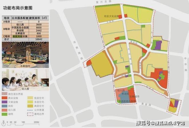 包含社区文化设施、菜场、幼儿园、医院等,这些设施主要都分布于B、C两大组团内: