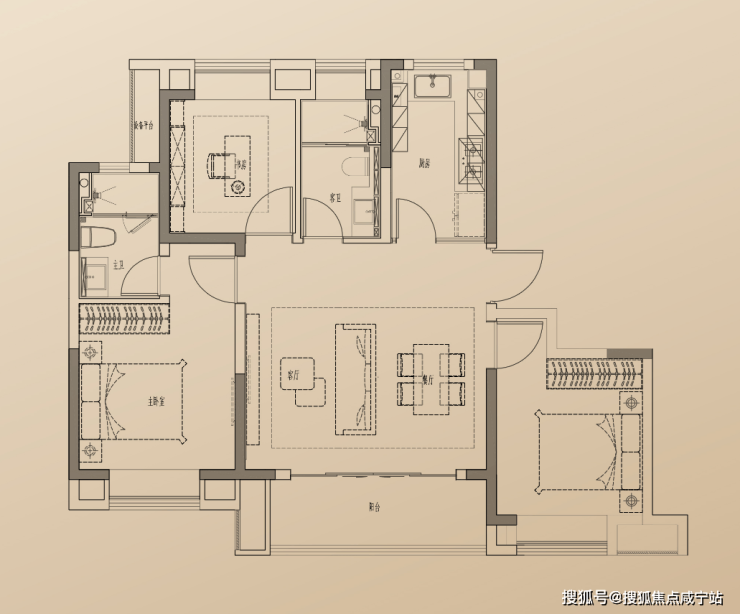 建面约100㎡3房2厅2卫,,餐厅、客厅、阳台一脉相连,居住尺度不断向外延伸。无论日常的休憩、玩乐亦或者是会谈来客,宴请朋友都显得从容大方。