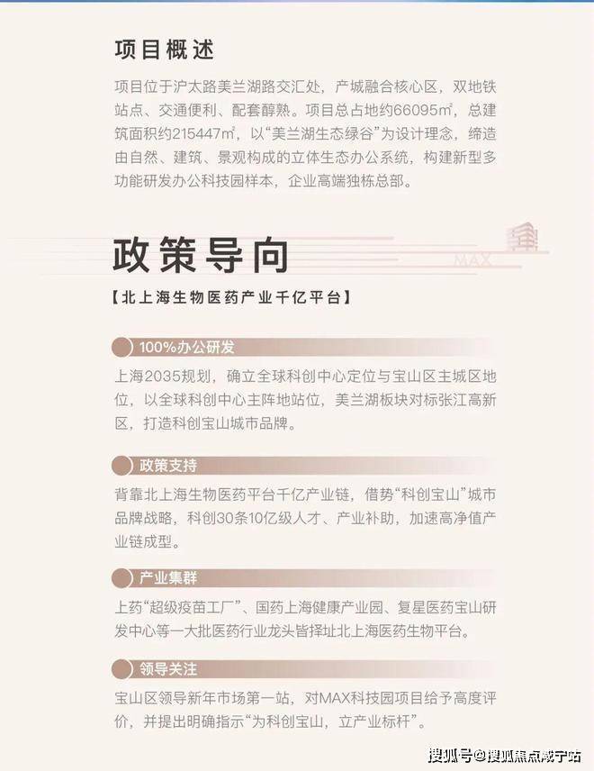 MAX科技园(宝山·美兰湖)项目将打造成宝山的科创新标杆,主要从事总部研发生物医药产业,C65科研用地,可环评,可通燃气,全上海双湖景观科技园区。独立入户设计,首层私属花园、270°采光、层层宽境露台、屋顶花园,立体生态办公。整个项目以美兰湖公园的绿色生态为设计理念,打造“美兰湖生态绿谷”,是“一企一栋”的总部独栋型产业项目。