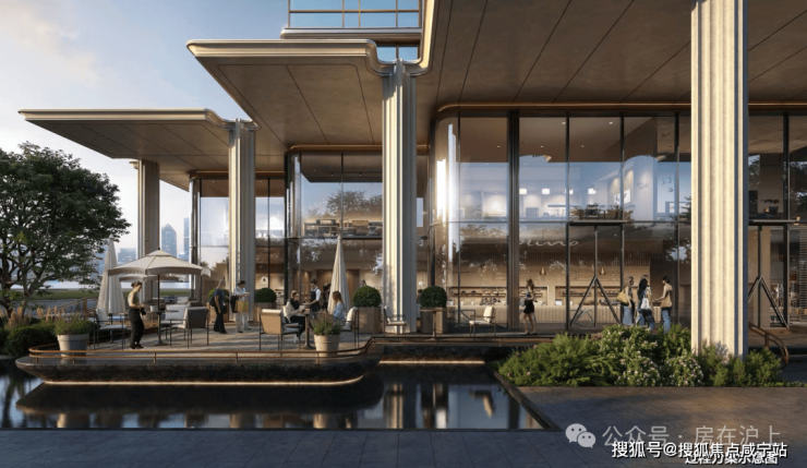 穿过园林,上海最大的约3500㎡下沉水院构成社区的核心灵魂,约13米的高差形成独特的“峡谷绿洲”,将黄浦江的水意象引入社区,中央平静水面与四周的会客舱、茶室、游泳馆形成呼应。