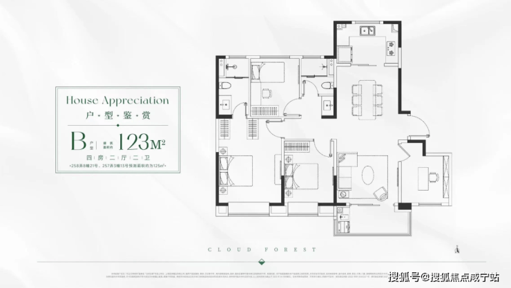 • 125㎡四房:南北通透,客餐厅 57 ㎡横厅,双套房设计