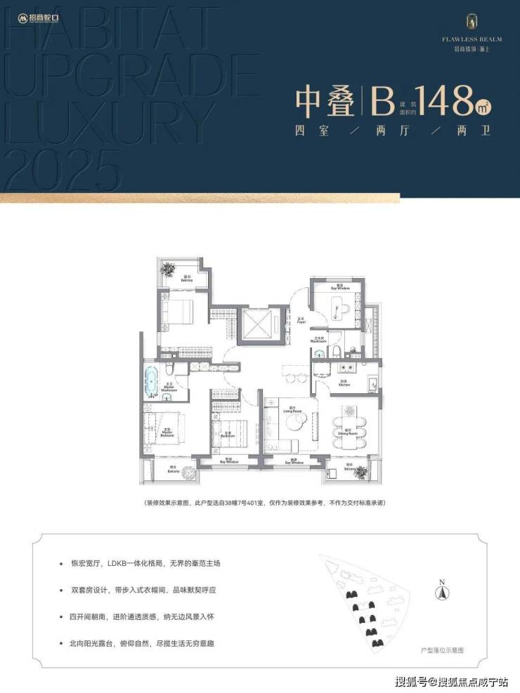 本宣传资料所涉及的户型仅供示意参考。仅为横拟本户型装修效果叠加装修设想进行展示、所示室内装修、家具、陈设、灯具、门窗等除注明外均不在交房范围之中;相同户型因楼栋楼展、单元等差别,局部结构、面积、功能布局、空间分制、门窗/管井形态位置等可能有不同,并且强弱电箱、插座位置等均未在户型围中体现,具体以政府部门及终审定的图纸和《商品房买卖合同》为准,本广告制作日期为2025年5月20日,有效期至2025年6月20日。开发商:上海招宜置业有限公司,推广名:招商臻境。