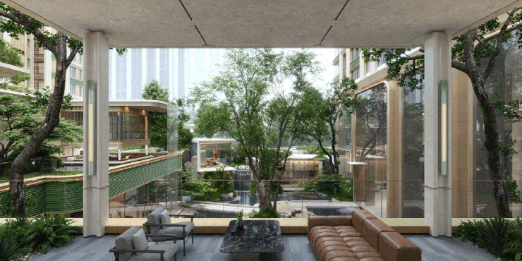 项目选址于静安区黄金腹地,南向紧邻浦西最大城市绿地——大宁公园。得天独厚的自然资源为设计提供了绝佳的契机,我们以“自然引入,立体共生”为核心策略,致力于构建一种人与自然在城市语境中的共生关系。