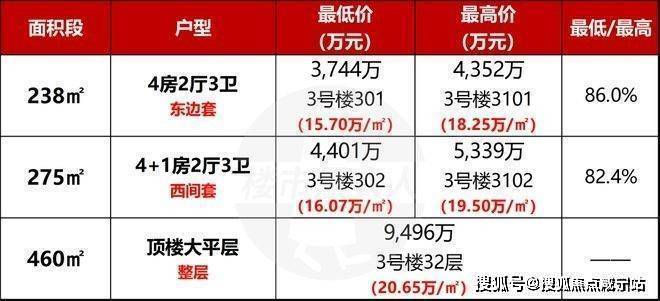 整栋楼的最高总价,毫无悬念是32层顶平,约9496万.而整栋楼的最低总价,则是3层01室238㎡,3744万.它把3号楼的总价门槛压到了3700万级,但说实话,这更像是一个“名义上的最低门槛”.因为从价值层面看,低区这次卖的并不是普通意义上的低楼层,而是更贴近核心花园、水景和园境界面的绝版资源.它的便宜,并不代表价值弱,而是和高区卖着不同的价值重点.