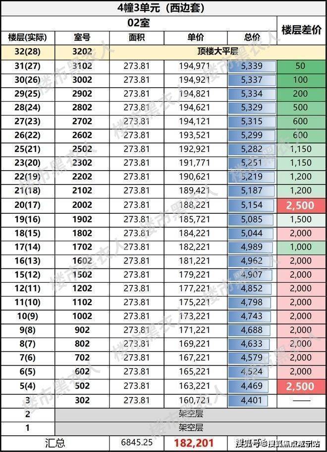真正的价格跳跃,反而集中在中低区往中高区跨越的那一下.比如238㎡从20层到21层,单价差要达到2500元/㎡.也就是说,西边套是在某几个关键舒适层、景观层上做了跳价,到了更高区以后,反而把价差压平.