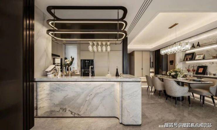 室内大量运用奢石,搭配统一木饰面与皮革材质,通过圆弧设计、隐形出风口、无高差客厨地面等“隐形美学”处理,让奢华与舒适完美融合。