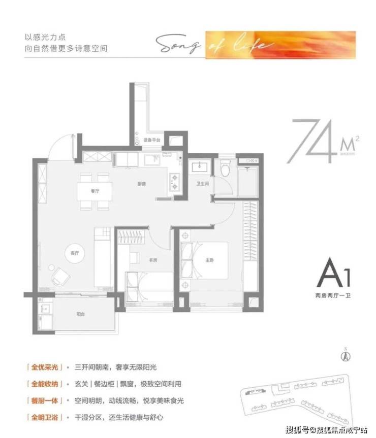 建面约74㎡2房竟做到三开间朝南,其中两卧均朝南,同时面宽甚至大于进深,这比同类产品卧室一南一北狭长布局要舒适得多。