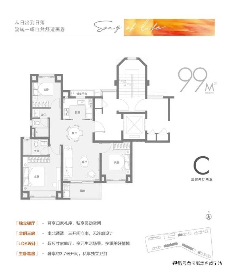 建面约99㎡3房2卫户型不仅保留三开间朝南和餐客厅一体化的优势,更在尺度上大踏步进阶。