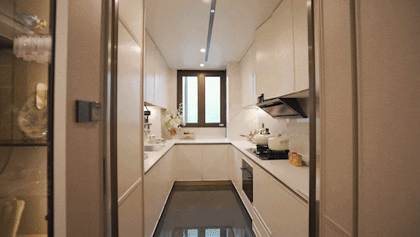 项目整个餐客厅均为岩板交付,岩板的尺寸达到了2.4米*1.2米,这是市面上非常罕见的大板配置,即便是市区豪宅,用的大尺寸也不过是1.8米!