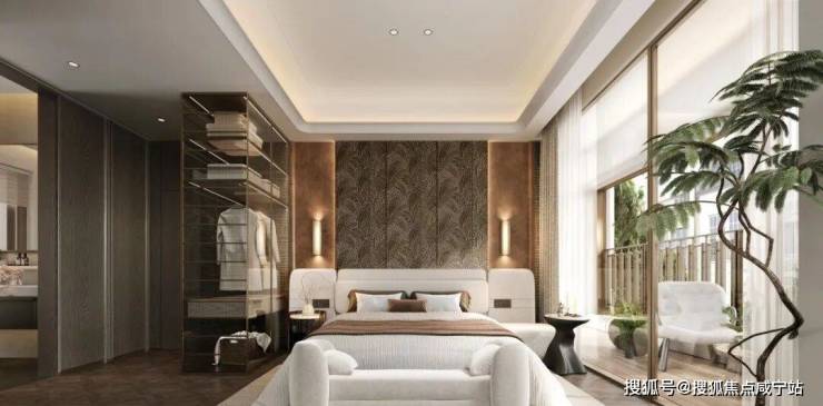 主卧建面约 25㎡ ,自成一方小天地。除了设计有干湿分离的卫浴空间,还特别打造了步入式衣帽间,满足主人的 “收藏欲”;加之南北通透的布局,连接双联阳台,阳光浸润生活,清风鲜活呼吸。