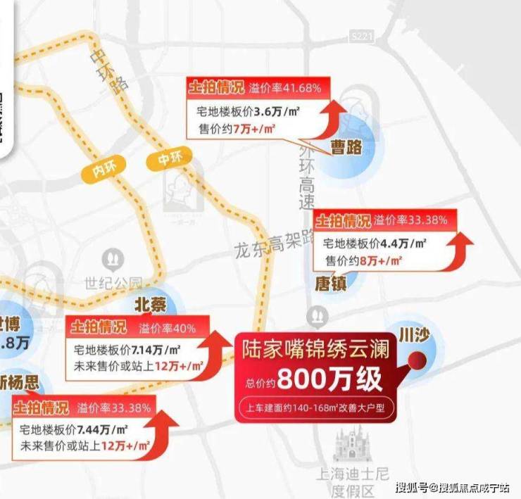 据最新土拍,曹路宅地溢价率高达41.68%,预计未来售价将突破7万+/㎡;而去年拿地的唐镇地块,溢价率同样高达约33.38%,售价已突破8万+/㎡。