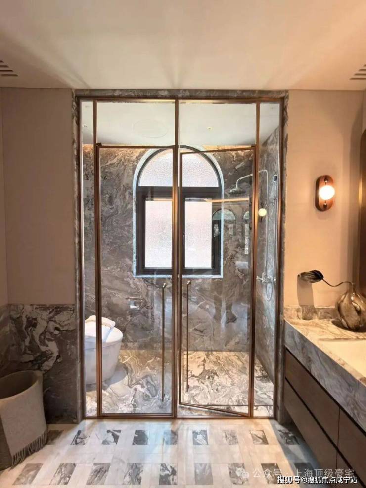 建筑基层石材选用近拟传统皇家建筑所用金山石的世贸金麻,经手工凿毛、酸洗做旧处理,搭配铜质落水管、水纹压花玻璃,每一处细节都在诉说海派大宅的优雅与贵重。