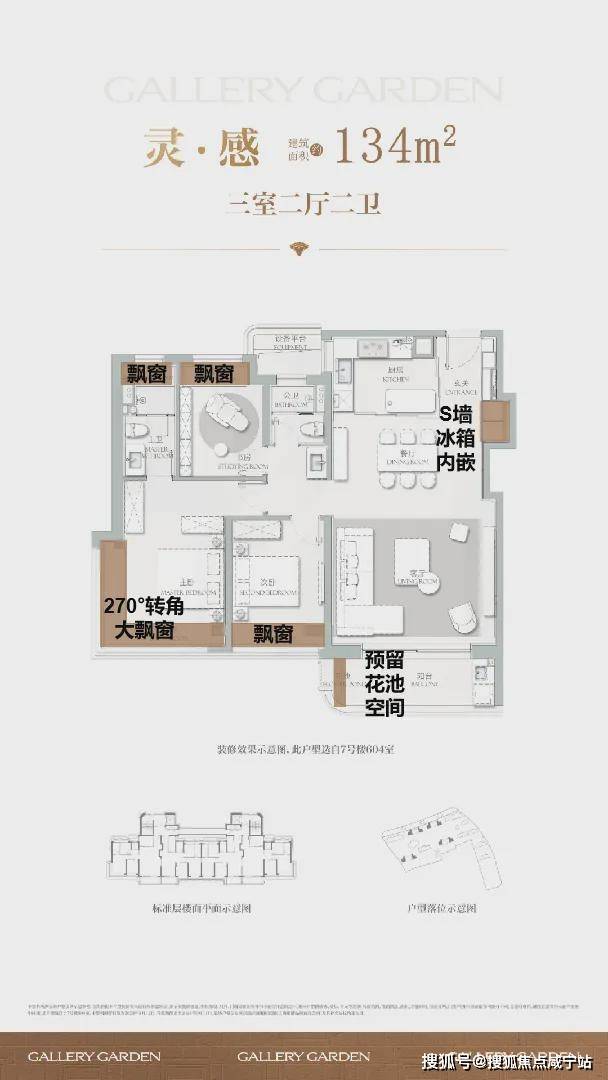建面约134㎡户型,还打造了270°转角飘窗观景套房,进一步增强了空间的通透感和层次感,让主人仿佛置身于自然与美景之中,尽享生活的惬意与美好。